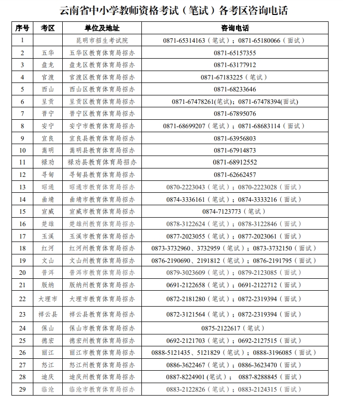 云南省中小学教师资格考试(笔试)考区咨询电话
