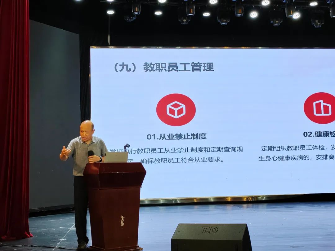 他强调,各民办学校要认真做好以下工作:一是提高思想认识。把安全工作放在首位,及时解决存在的问题。开学前,认真做好风险隐患排查、公共设施安全维护、教学设施设备检修、校园环境卫生等各项工作。二是加强队伍建设。选拔责任心强、业务素质高的人员负责安全管理工作,定期组织培训和考核,激发广大教职工参与安全管理的积极性和主动性。三是强化宣传教育。将此次培训的内容传达给每一位教职工,形成全员共治的良好局面。开展多种形式的安全教育活动,提高师生的安全意识和自我保护能力。保持学校与家长的常态化联系,引导家长关注孩子的安全问题,共同做好学生的安全教育工作。四是压实责任链条。明确各部门、各岗位的安全职责,层层签订校园安全责任书,将校园安全责任落实到每一个人身上。