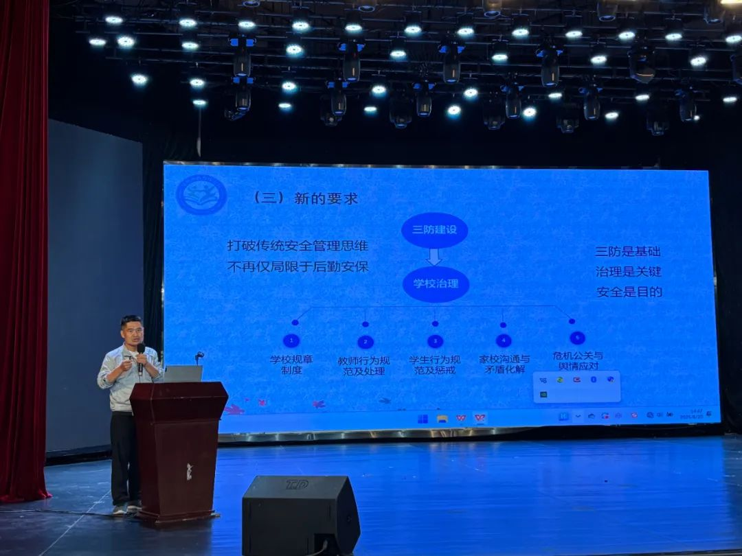 苏艳荣处长在《校园常见风险防范和问题处置》专题培训中,从校园安全管理工作的难点和痛点出发,分析了校园安全管理工作的新形势、新挑战、新要求,以及各类潜在的校园安全风险类型与特征,强调要树立“全面、系统、积极”的安全观,真正发挥好教师队伍、安全课程、教育途径在校园安全教育工作中“主力军”、“主战场”和“主渠道”的作用,认真落实好“十查三关注”工作。详细讲解了校园安全预防及处置等工作全流程的实施步骤、突发事件应急预案的关键要点等。培训内容紧密结合实际,为学校日常安全管理工作提供切实可行的指导,帮助大家掌握科学有效的校园安全管理方法。