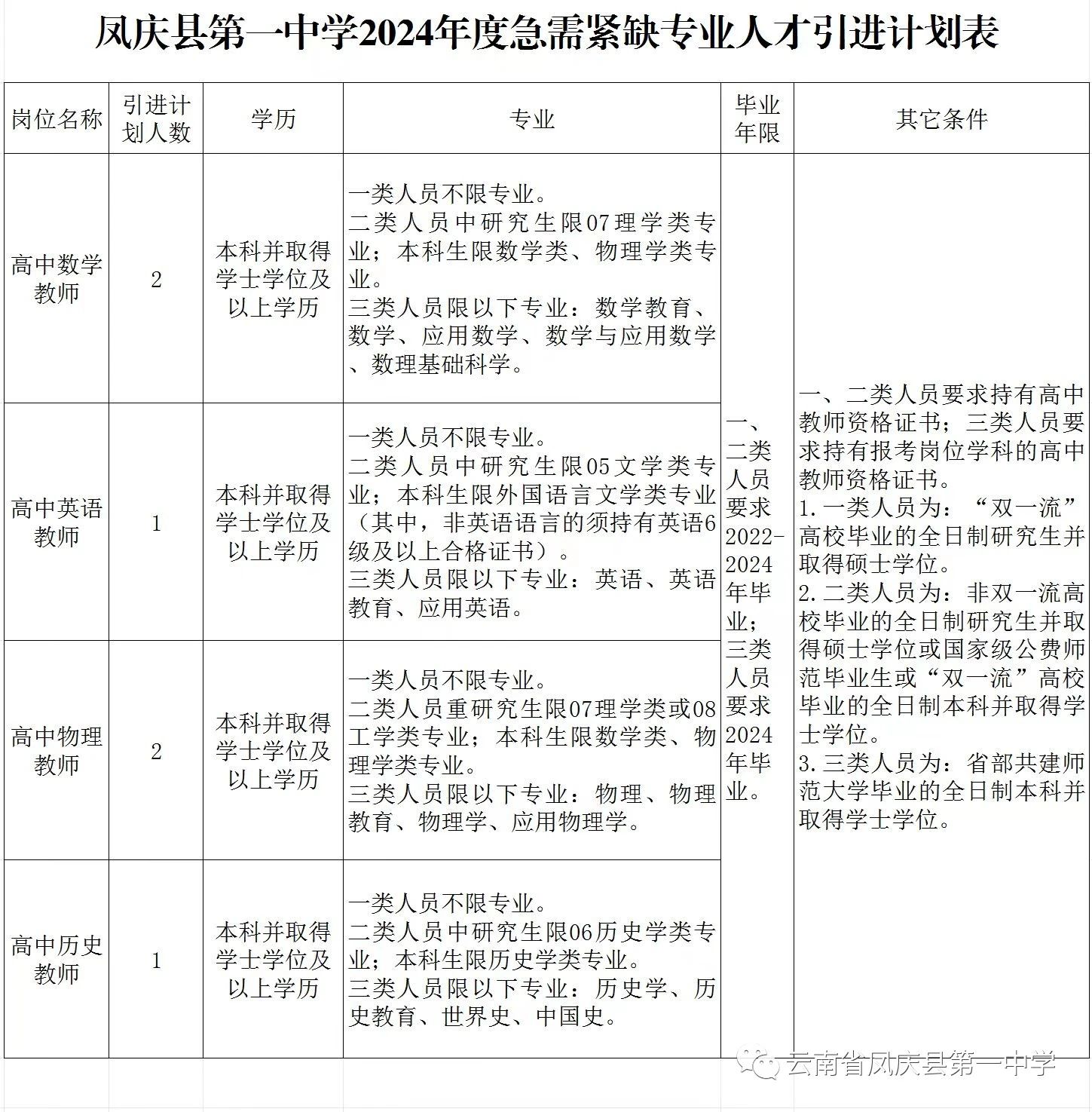 云南省凤庆县第一中学2024年拟招聘教师信息