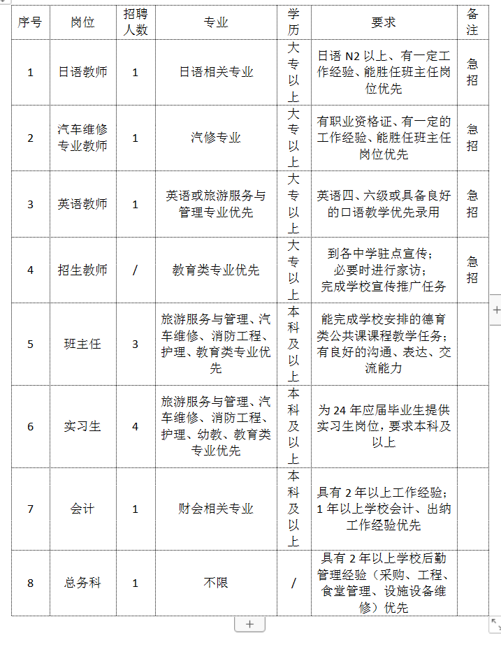 备注:急招教师面试合格后,2月份入职参加培训,合格后马上上岗。