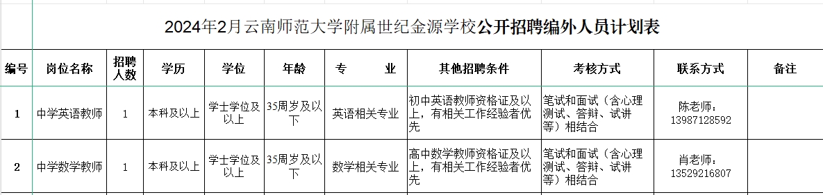 参照《云南省事业单位公开招聘工作人员办法》(云人社发〔2016〕182号)等有关文件规定,结合工作需要,经学校研究,决定面向社会公开招聘编外中学英语教师1名,中学数学教师1名,共计招聘2名。具体招聘范围和条件,详见学校网站《2024年2月云南师范大学附属世纪金源学校公开招聘编外人员计划表》(附件1)