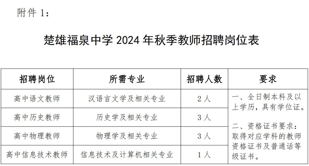 根据学校发展需要,招聘高中部分学科专任教师9名(详见附件1《楚雄福泉中学2024年秋季教师招聘岗位表》)。