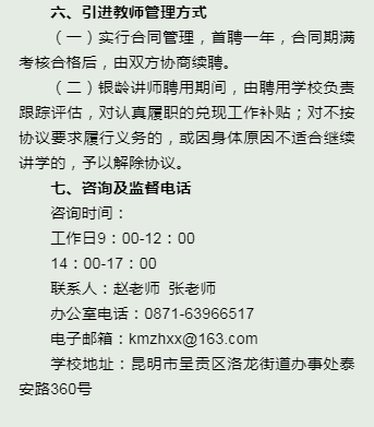 昆明市中华小学教育集团成立于2019年12月,以昆明市中华小学为龙头学校,目前一校十址。依据《中共昆明市委办公室 昆明市人民政府办公室关于印发<昆明市银龄讲学三年行动计划(2021—2023年)>的通知》(昆办通〔2021〕6号),为深入推进昆明市中华小学教育集团的核心竞争力,提升教育集团的教育教学质量,昆明市中华小学教育集团2024年计划引进银龄讲师若干名,并常年引进银龄讲师。现将有关事宜公告如下: