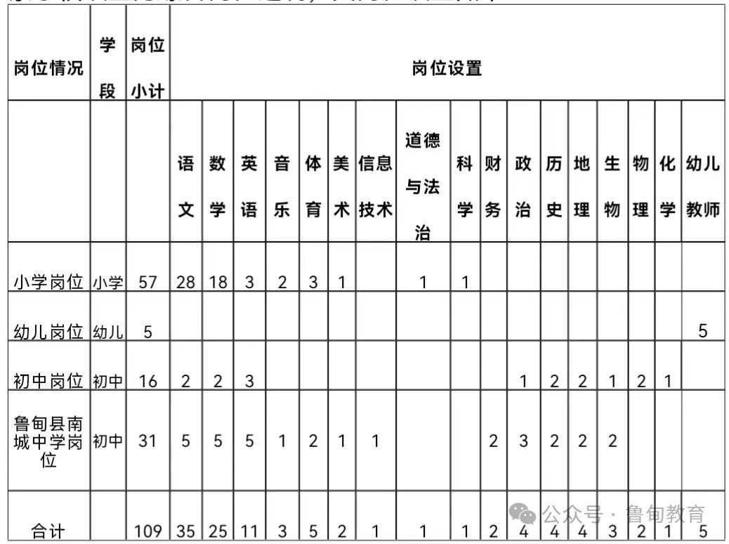 本次选调设置109个岗位,南城中学单独设岗选调,其余学校设置为综合岗位选调,其岗位设置如下: