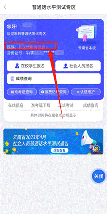 完成实名认证后,在APP首页找到“普通话测试报名”,点击进入普通话水平测试专区界面,选择“云南省普通话培训测试中心”后,点击“进入首页”。